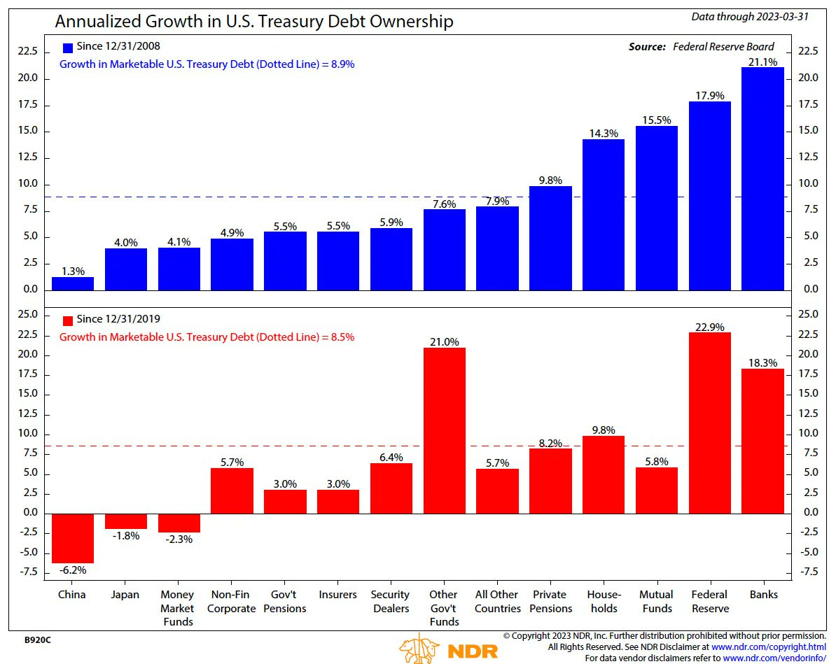 But here's the rub: nobody’s buying this debt deluge. In the old days, pension funds, foreign banks, and retail punters snapped up Treasuries like hotcakes. Now, it's mostly government funds, banks, and the Fed stepping in, like a family covering for a relative’s gambling habit. When banks and the Fed buy, they don’t dip into vaults—they print the money, weakening the dollar faster than a bad trade deal. This printing frenzy lowers bond yields, forcing investors to flee safe havens for riskier bets like crypto, because who wants 2% on bonds when inflation’s eating 5% of your cash? It’s the spark for bull runs, pushing asset prices up as dollars lose their mojo.