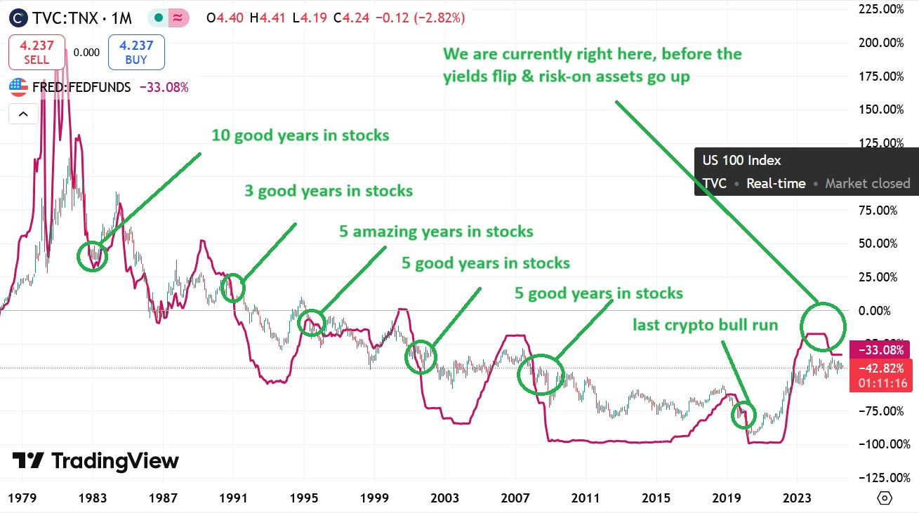 But the real kickoff doesn't happen until they flip: the Funds rate drops below the 10-year, unleashing easier credit like opening the floodgates on a dam. We're still in the "brace yourself" phase, with crypto languishing like a festival tent in a drizzle. This inversion's a warning light, not the green flag—until it uninverts, the bull's just warming up its engines.