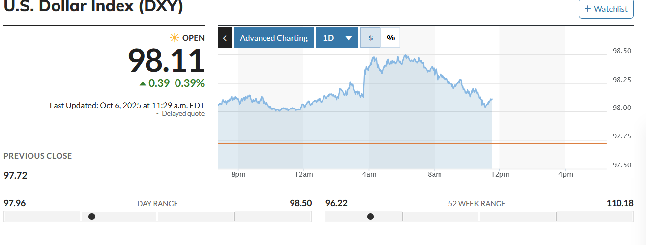 Crypto's priced in dollars, so the dollar's strength—tracked by the DXY index—is a massive bull run barometer. As of October 6, 2025, DXY's at around 98.11, a level that's kept crypto suppressed like a bad economy crushes dreams.